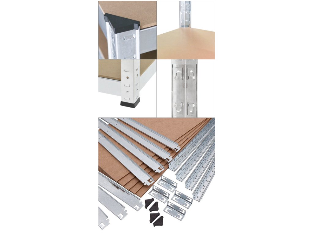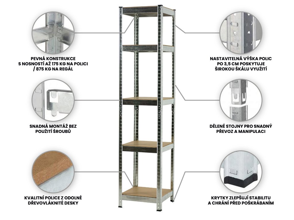 Samotný regál neobsahuje žádný spojovací materiál. Jednotlivé díly není třeba vzájemně sešroubovat, k fixaci slouží kompatibilní aretační prvky regálu. Nemusíte tak složitě hledat spoustu nářadí, nezdržujete se šroubováním a dotahováním spojů a netrávíte hodiny skládáním regálu. Jedinou výjimkou, kdy budete používat šrouby a vruty, je uchycení již sestaveného regálu do zdi, příp. spojení více regálů k sobě. Tyto kroky výrazně přispějí k vaší bezpečnosti.