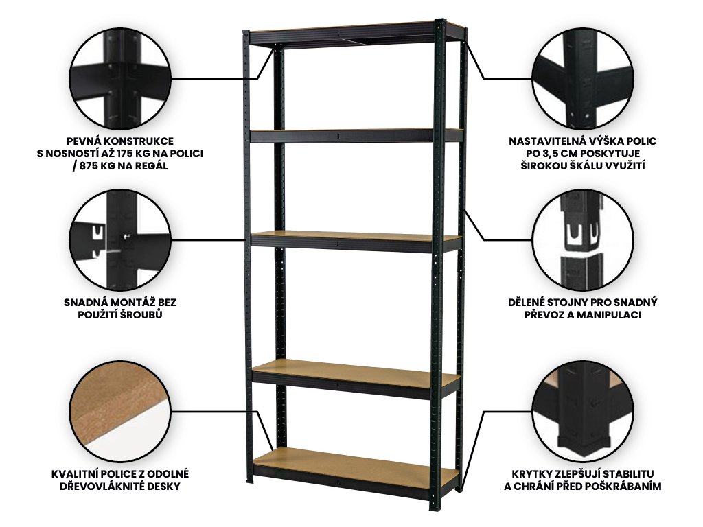 Regál 180x75x40 cm lakovaný 5-policový, nosnost 875 kg - ČERNÝ